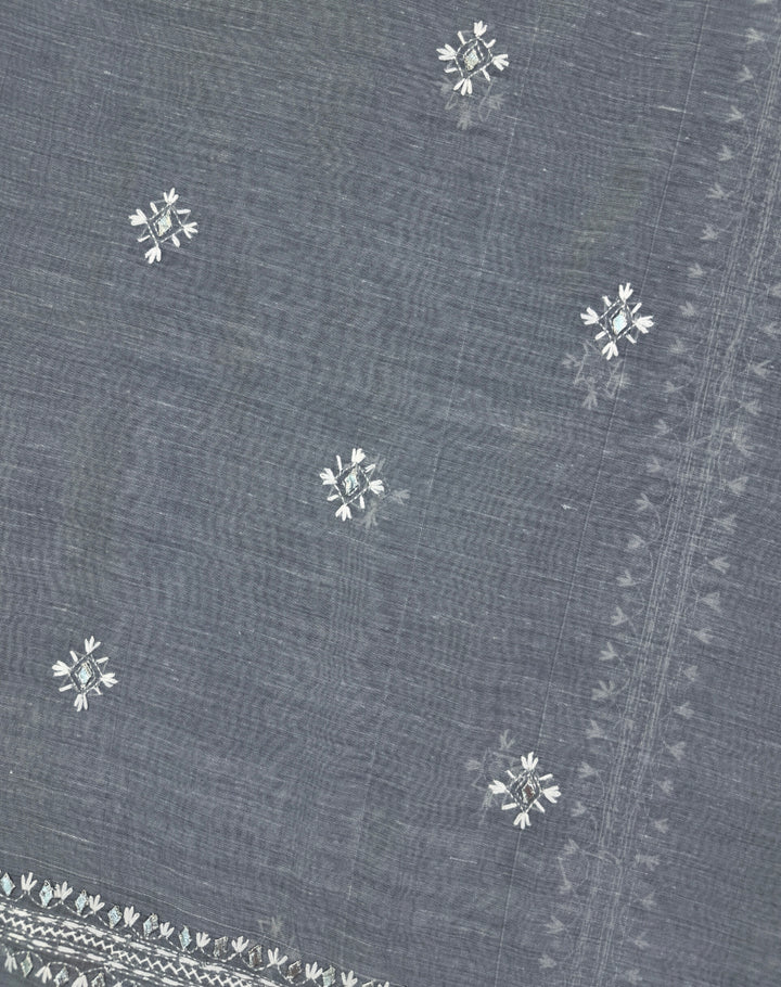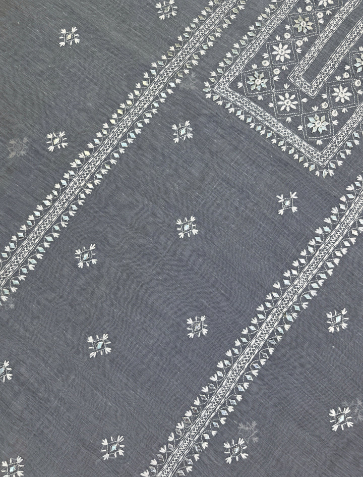 - Craft: The Shirt showcases a rectangular neck and vertical panels woven in a blend of Kantha Work accentuated with Pitta Gotta Work, enhanced with delicate floral motifs spray all over it. Comes with separate sleeves with an intricate border. Its Dupatta has a solid double-sided border with floral motifs spray across it.