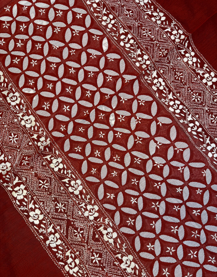 - Craft: Dwell in the beauty of this gorgeous Parsi Ghara attire based on Khaddi Silk - Shirt featuring handmade applique work in the mid panel, alluring Parsi Work at the side panels finished with a solid Parsi Ghara border.