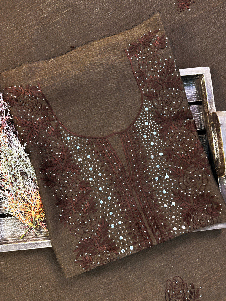The Shirt showcases a solid neckline crafted in fine Parsi work, prominent floral motifs on the front, complemented by smaller motifs on the back. Separate sleeves feature a delicate embroidered border on it. The Kamdani spray all over the shirt adds a touch of class and bling to it.