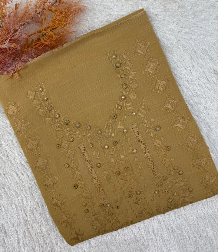 The Dupatta has delicate floral motifs spray all over it in Pakka tanka work and accompanied by a plain matching trouser. - Fabric: French Khaddar