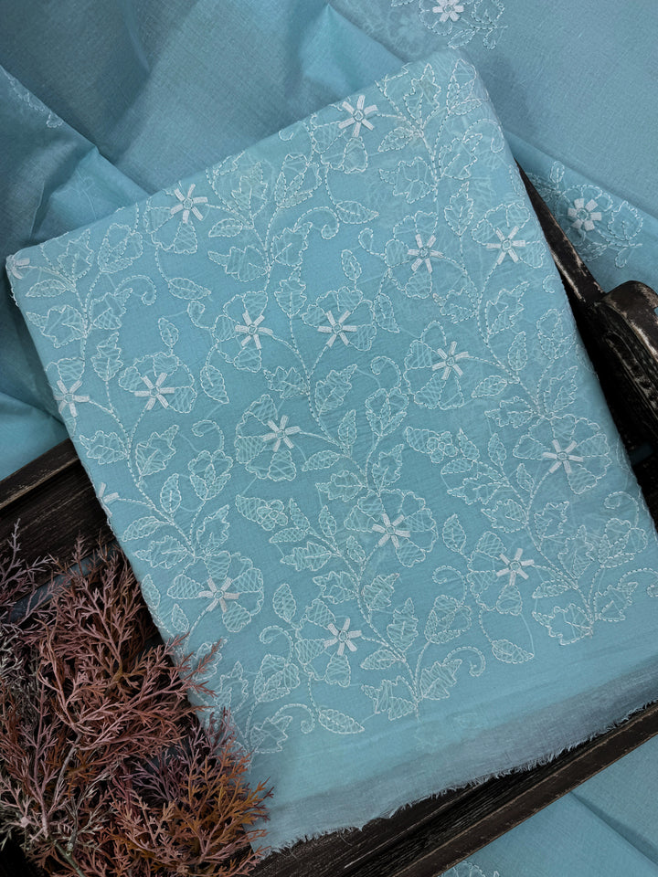 Craft: This elegant Chikankari ensemble features delicate floral motifs scattered across the front and back of the shirt, finished with a solid embroidered border at the front.
