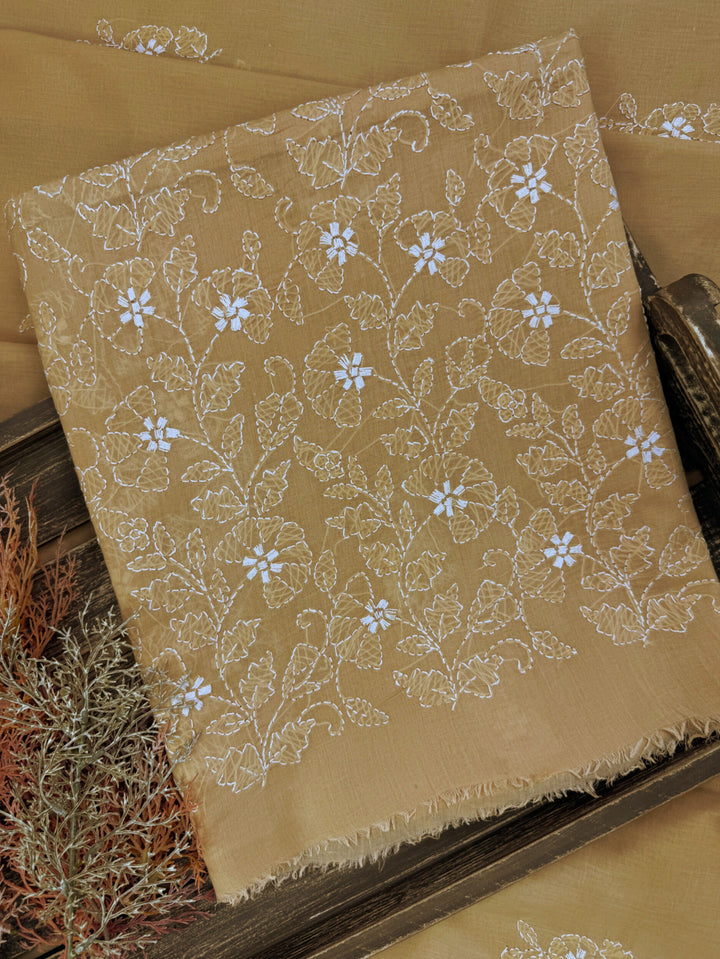 Craft: This elegant Chikankari ensemble features delicate floral motifs scattered across the front and back of the shirt, finished with a solid embroidered border at the front.