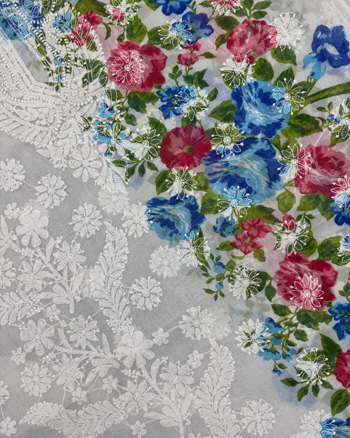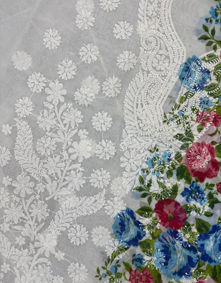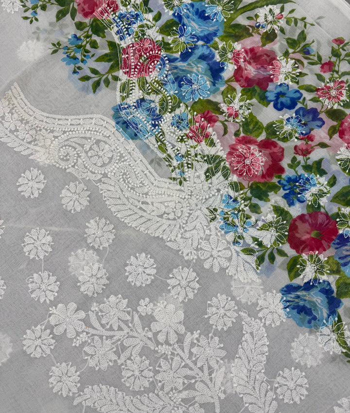 - Craft: Immerse yourself in the beauty of this enchanting Chikankari Kurta with exclusive Digital Printing. One side of the Kurta has delicate White Chikankari embroidery all-over it, a beautiful neckline in mid contemplated with Digital Printing in bright hues on the other side making this Kurta an absolute class. The back of the Kurta has floral motifs on it accompanied by separate embroidered sleeves.